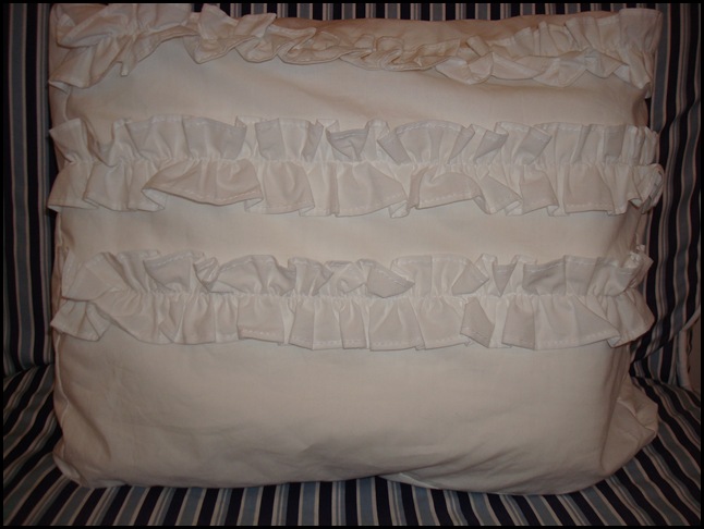 Here is the ruffled cloth bag that the shower curtain came in. I stuffed it with towels so you could see that it will make a cute pillow. It had a little tag on it so I snipped it off.